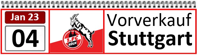 Für das Auswärtsspiel gegen den VfB Stuttgart am 21. Spieltag der Bundesliga-Saison 2022/23 am Karnevalssamstag, 18. Februar 2023, 15.30 Uhr, können Mitglieder des 1. FC Köln sowie des Fan-Projekts ab Donnerstag, 5. Januar, 10 Uhr, Eintrittskarten über den FC-Ticketshop bestellen. Eine zweite Verkaufsphase startet um 16 Uhr.